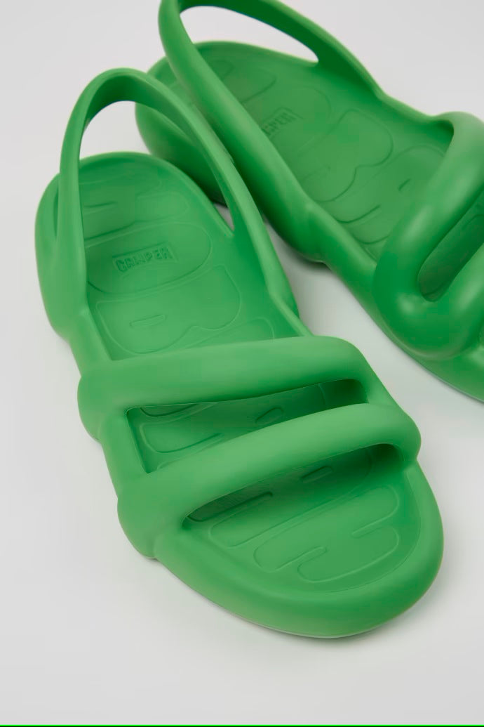 Green unisex sandals with no-waste direct injection construction, and XL Extralight® Organix™ 3.0 outsoles with 30% biocircular components.