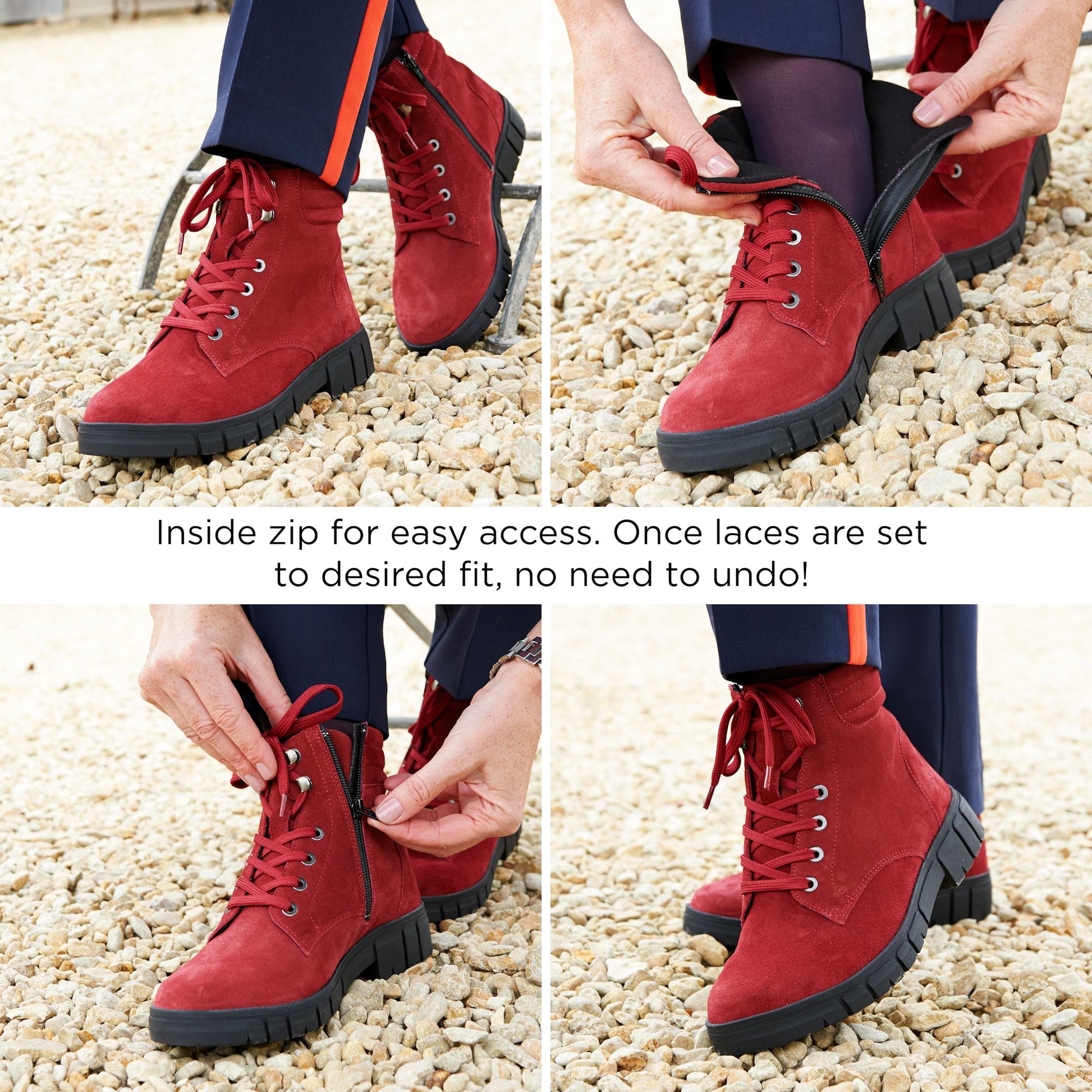 Water Resistant suede ankle boot with a chunky, grippy rubber sole. Set laces to desired fit and use the inside zip for ease of foot entry.